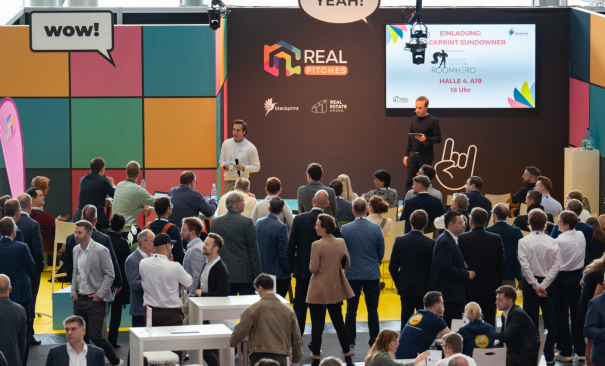 Eine von insgesamt zwei Pitchbühnen der Real Pitches 2025 – das Zusammentreffen von Technologie, Innovation sowie Bau- und Immobilienwirtschaftlicher Relevanz.