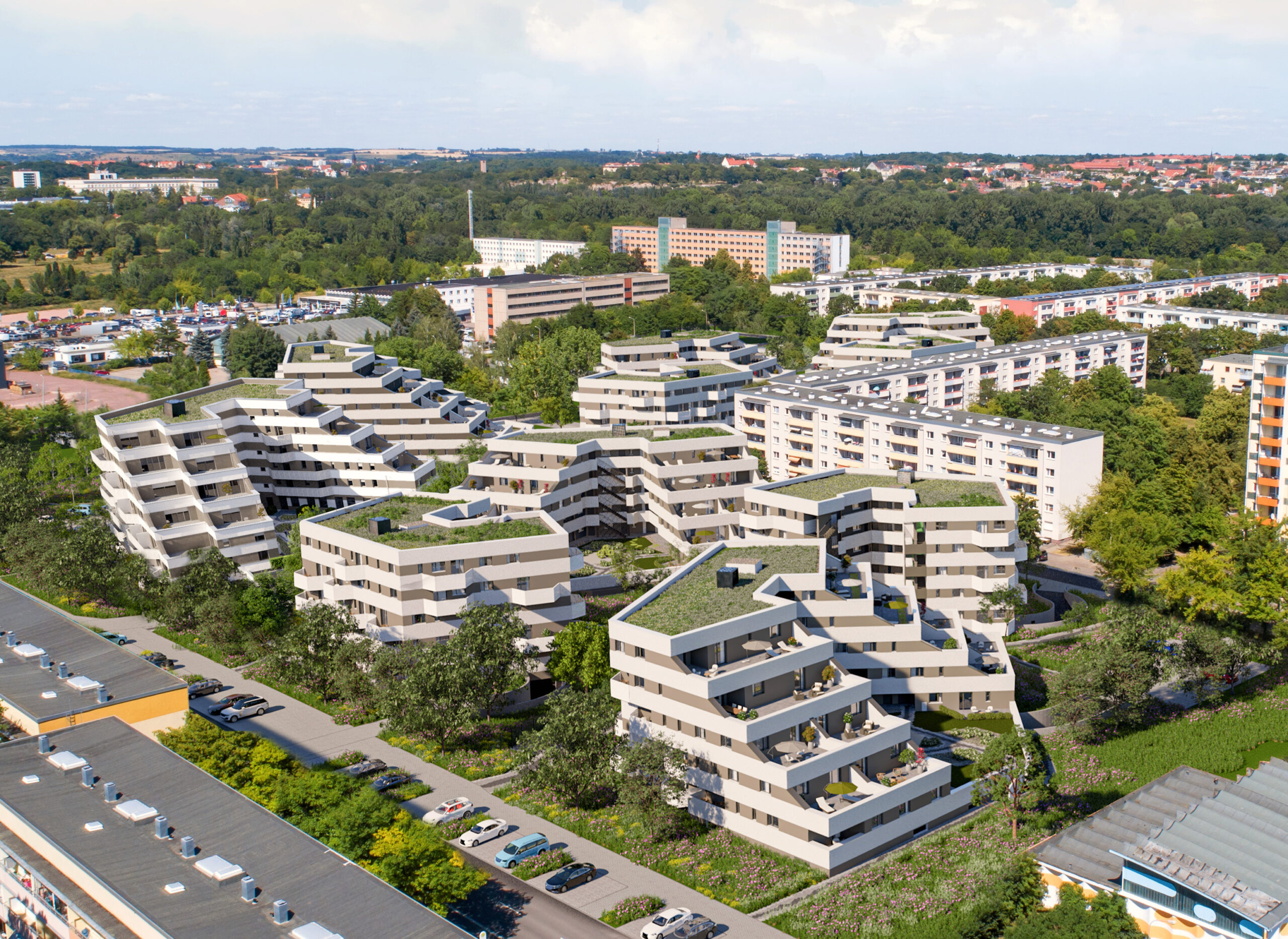 Das Projekt steht vorbildhaft dafür, wie aus Bestand Neues entstehen kann. In drei Gebäudeteilen mit drei bis sieben Geschossen entstehen Ein- bis Fünf-Zimmer-Wohnungen mit insgesamt rund 10.600 Quadratmetern Wohnfläche. Die energetische Sanierung der Gebäude erreicht den Effizienzhaus-40-EE-Standard. Dies wird möglich durch serielle Sanierung der Fassaden, optimierte Anlagentechnik wie Lüftungsanlagen mit Wärmerückgewinnung, Fernwärme sowie Photovoltaik-Anlagen. So ergeben sich CO2-Emissionen von lediglich rund 5 kg/m²a (Kilogramm pro Quadratmeter und Jahr), was einem besonders klimafreundlichen und hocheffizienten Spitzenwert entspricht. Das nachhaltige Profil des Wohnensembles wird durch die Einsparung grauer Energie mittels bestmöglicher Nutzung des Bestands, den Erhalt des Baumbestands, Regenwasser-Retention sowie Gründächer komplettiert.