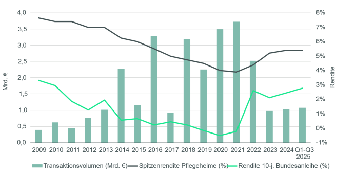 - Spitzenrendite (Nettoanfangsrendite) für Pflegeheime weiterhin stabil bei 5,4 Prozent