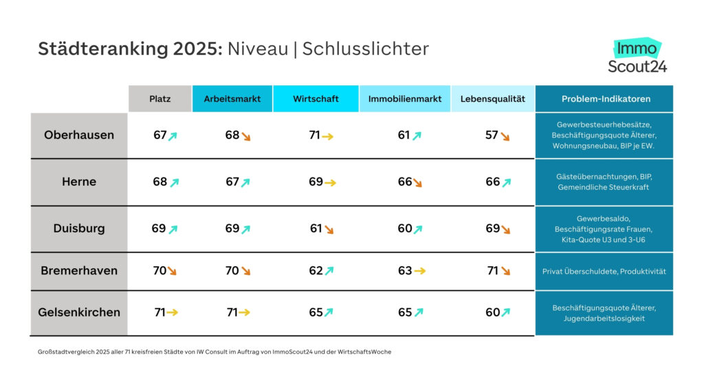 - Pott gegen Süd: München, Stuttgart und Ingolstadt bleiben Spitzenreiter im Niveauranking, Gelsenkirchen, Duisburg und Bremerhaven sind weiterhin Schlusslichter.