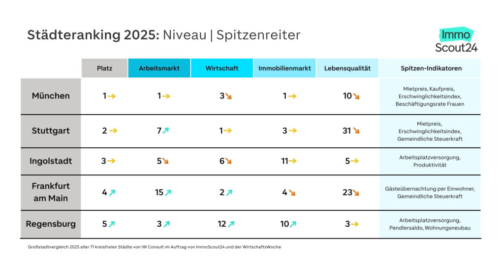Das IW Consult hat im Auftrag von WirtschaftsWoche und ImmoScout24 alle 71 kreisfreien Städte Deutschlands mit mehr als 100.000 Einwohner:innen verglichen. Das Städteranking bewertet die Städte in den Bereichen Arbeitsmarkt, Wirtschaftsstruktur, Immobilienmarkt und Lebensqualität (Niveauranking) sowie deren Entwicklung der letzten fünf Jahre (Dynamikranking).