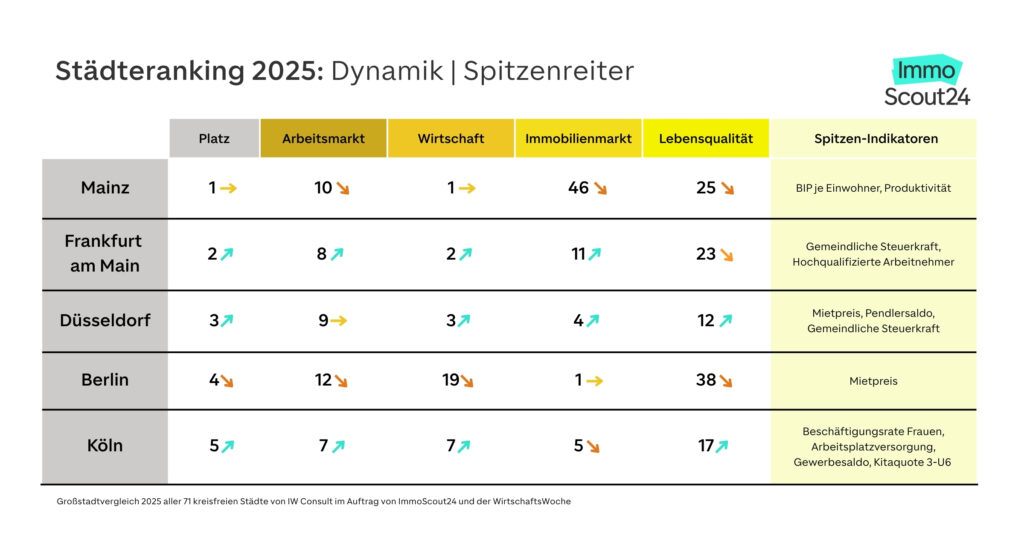 Mainz führt zum vierten Mal in Folge das Dynamikranking an, welches die Entwicklung der vergangenen fünf Jahre abbildet. Der BioNTech-Effekt wirkt nach: Das BIP je Einwohner und die Produktivität zeigen weiterhin Spitzenentwicklung. Doch beim Infrastrukturindex (Rang 43) zeigt sich: Der Ausbau der Zukunftsinfrastruktur hinkt der wirtschaftlichen Dynamik deutlich hinterher. Frankfurt am Main rückt im Dynamikranking von Platz 3 auf Platz 2 vor – angetrieben von der bundesweit höchsten Steigerung der gemeindlichen Steuerkraft (Rang 1) und hoher Zunahme hochqualifizierter Beschäftigter (Rang 2). Düsseldorf landet auf Platz 3 mit starken Werten in Wirtschaft und Arbeitsmarkt. Berlin ist erstmals seit 2016 nicht mehr unter den ersten Plätzen (Platz 4). Die Hauptstadt entwickelt sich schwächer beim Anteil hochqualifizierter Beschäftigter (Rang 28 statt 10); außerdem stagniert die Jugendarbeitslosigkeit auf einem Niveau von 9 Prozent. Hinzu kommt ein schwacher Neubau auf einem sehr angespannten Wohnungsmarkt.