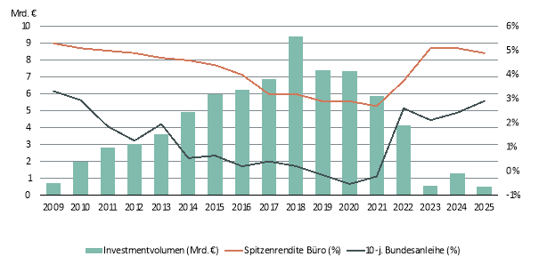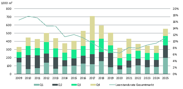 Auch jenseits der großen Abschlüsse zeigte der Markt eine lebhafte Dynamik: Mit 459 Vermietungs- und Eigennutzerabschlüssen lag die Anzahl leicht über dem Fünfjahresmittel von 440 und bestätigt eine breit gestützte Nachfrage über alle Größensegmente hinweg.