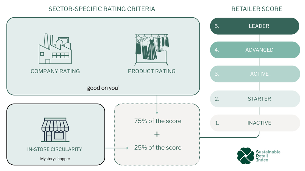 Als wichtigster Datenpartner fungiert Good On You, eine weltweit anerkannte und branchenweit genutzte Rating-Plattform, die tiefgreifende Expertise in der Nachhaltigkeitsbewertung von Lieferketten im Einzelhandel einbringt. Die unabhängigen Daten der Plattform machen 75 Prozent der Gesamtbewertung aus. Diese basieren auf öffentlich zugänglichen Informationen und nutzen 1.000 Datenpunkte pro Marke zu zentralen sozialen und ökologischen Themen. Die verbleibenden 25 Prozent stützen sich auf Audits von Drittanbietern zur operativen Praxis auf Filialebene.