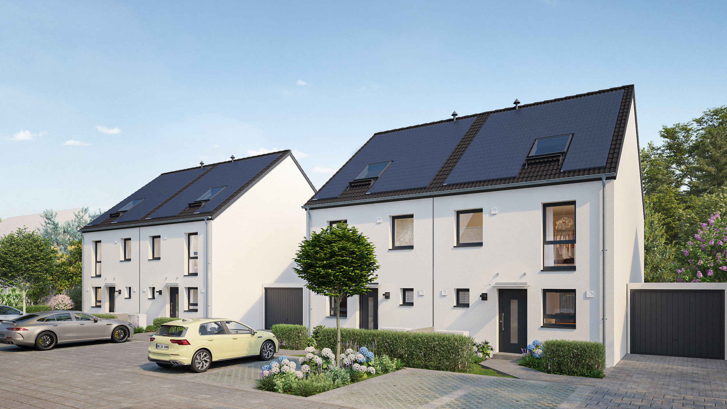 Der Vertrieb startet mit dem Verkauf von 10 Doppelhaushälften im hinteren Teil des Areals, der über die Gelleper Straße erschlossen wird. Jedes Haus ist mit einer eigenen modernen Luft-Wärmepumpe ausgestattet, die eine effiziente und ressourcenschonende Wärmeversorgung sicherstellt. Ergänzt wird dies durch Photovoltaikanlagen samt Speicher, die einen Großteil des Energiebedarfs umweltfreundlich deckt. Dies ermöglicht zukünftigen Bewohnern nicht nur einen nachhaltigen Lebensstil, sondern auch dauerhaft niedrige Energiekosten. Neben dieser Ausstattung verfügen alle Häuser über einen Garten mit Terrasse sowie eine eigene Garage plus Stellplatz.
