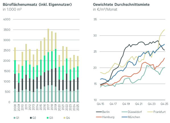 Steigende Spitzen- und Durchschnittsmieten unterstreichen das Qualitätsbewusstsein der Nutzer / Büroflächenumsatz in den Top-5-Märkten im Jahr 2025 mit 2,23 Millionen m² leicht unter Vorjahresniveau / Die Leerstände weiten sich in dezentralen Lagen und energetisch veralteten Objekten aus