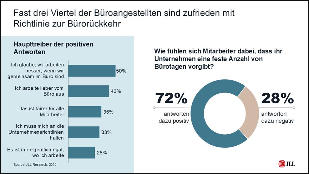 Hybride Arbeitsmodelle sind bei vielen Unternehmen zum Standard geworden und die Belegschaften haben sich mit den Vorgaben an eine fixe Büroanwesenheit weitgehend arrangiert. Dennoch wünschen sich viele ein besseres Arbeitsplatzerlebnis. Das belegt die international angelegte Studie „Workforce Preference Barometer 2025“ von JLL, an der 8.700 Büroangestellte von Unternehmen mit mindestens 1.000 Mitarbeitenden in 31 Ländern teilgenommen haben. Aus Deutschland waren es 382 Personen.