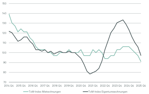 Sowohl bei Mietwohnungen als auch bei Eigentumswohnungen verringerte sich 2025 die Zeit, die angebotene Objekte durchschnittlich am Markt waren. Der ToM-Index für die Verweildauer von Mietangeboten ist seit Mitte 2024 kontinuierlich gefallen und erreichte 2025 einen neuen Tiefstand von 91 Punkten. Das entspricht im bundesweiten Mittel 30 Tage und damit fünf weniger als im Vorjahreszeitraum. Auch die Vermarktungsdauer von Eigentumswohnungen hat sich zum Jahresende 2025 im Bundesdurchschnitt spürbar um 27 Tage auf 67 Tage verkürzt.