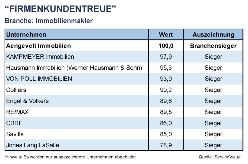 Triebfeder ist seit 116 Jahren die persönliche, professionelle und partnerschaftliche Zusammenarbeit mit den Auftraggebern, verbunden mit dem Ziel, die Dienstleistungsqualität stets zu optimieren. Mit Erfolg: So wurde Aengevelt auch in der erst kürzlich veröffentlichten aktuellen Studie “Höchste Firmenkundentreue“ des renommierten SZ Instituts, die die Kriterien Kundenzufriedenheit, Service, Qualität und Weiterempfehlung auswertete, in der Kategorie “Immobilienmakler“ mit der möglichen Höchstzahl von 100 Punkten als Branchensieger ausgezeichnet.