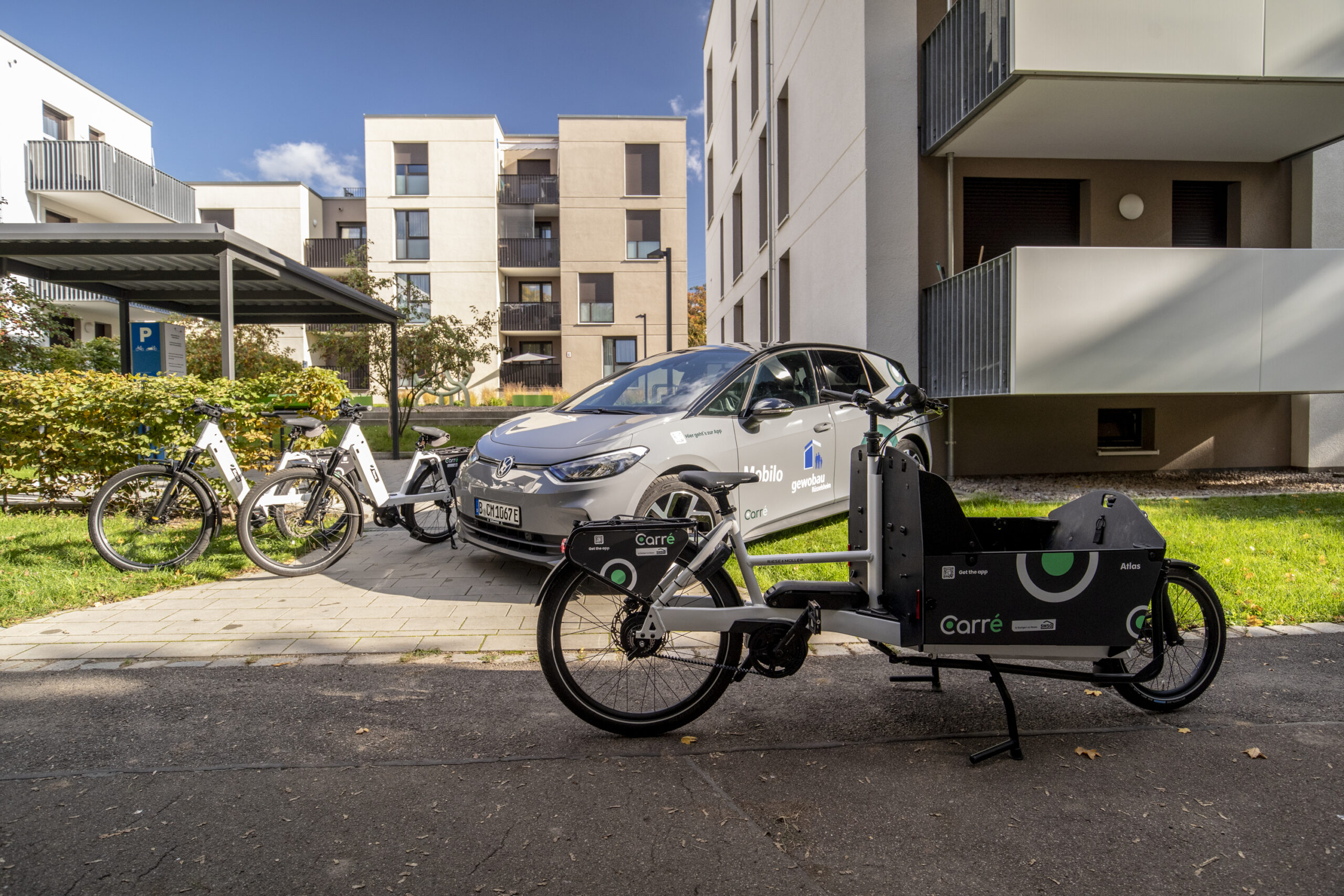 Das Konzept von Carré Mobility ermöglicht es Immobilienunternehmen, ihren Mieterinnen und Mietern moderne, nachhaltige Mobilitätsangebote direkt im Wohnumfeld zur Verfügung zu stellen. Je nach Bedarf kann das Sharing-Angebot exklusiv für die Bewohnerschaft oder auch öffentlich zugänglich für externe Nutzer:innen über eine App organisiert werden.